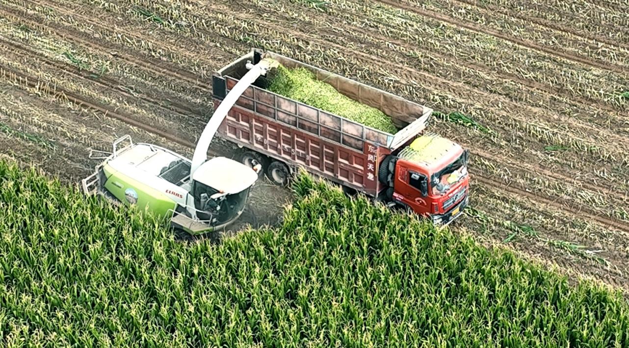 來到石崗墩畜牧園區(qū)前進(jìn)牧業(yè)飼草種植基地,大型青貯秸稈收割機(jī)和運(yùn)輸車輛正開足馬力在田間來回穿梭。伴隨著隆隆的機(jī)器轟鳴聲,一排排兩米多高的青貯玉米瞬間被連桿帶棒地收割,并粉碎成2.4厘米左右的青貯料,隨后被迅速裝車運(yùn)往各牧場。這一高效的機(jī)械化收割場景,不僅展現(xiàn)了現(xiàn)代農(nóng)業(yè)的強(qiáng)大力量,也極大地提高了收割效率,減輕了種植戶的勞動負(fù)擔(dān)。